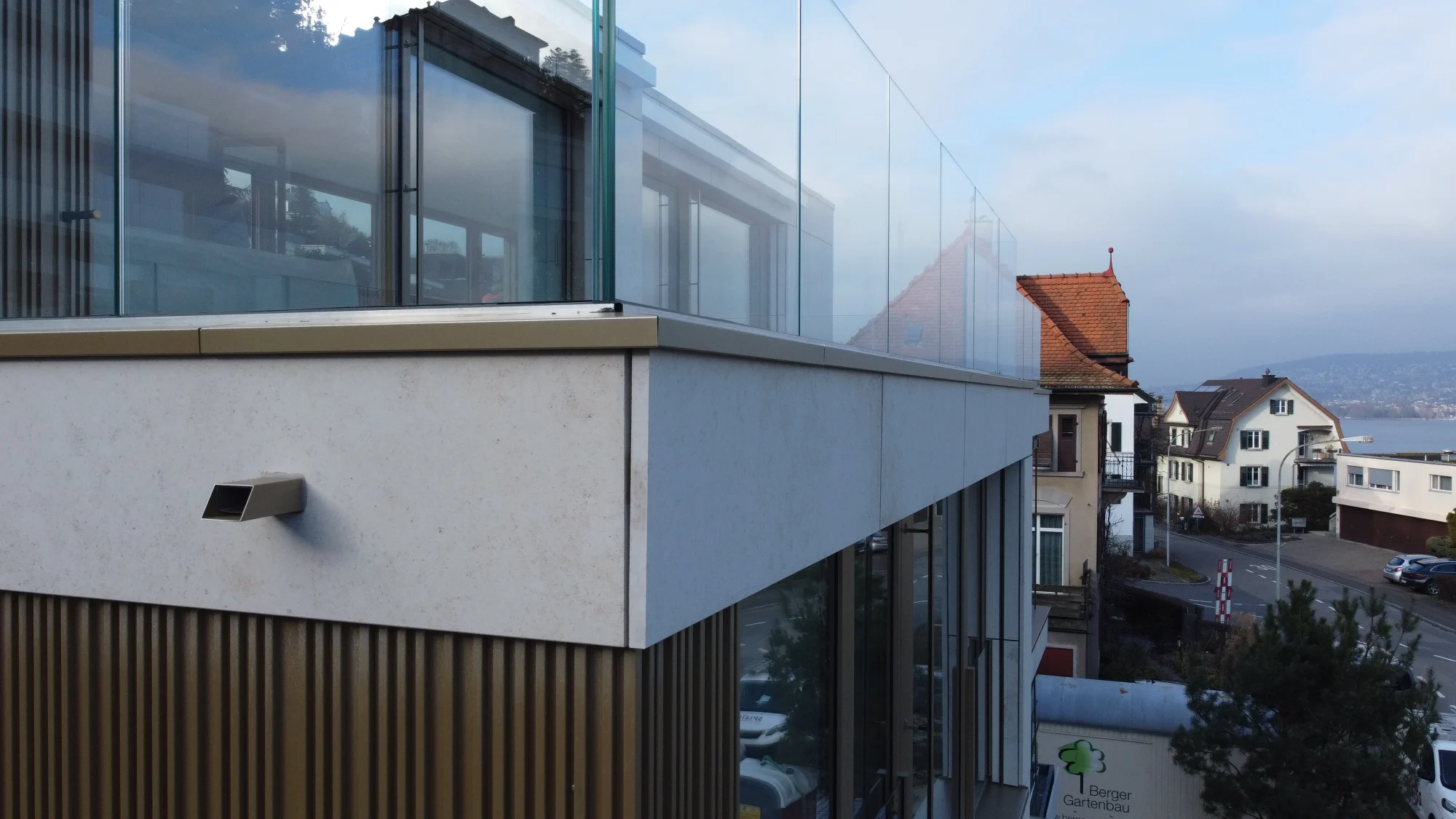 Für die Fassade des Hauses wurde ein hochwertiger Naturstein von der Firma GFT Fassaden AG verwendet, . Abgerundet wird die moderne Optik durch durch eine profilierte Alu-Verkleidung von Magro AG, das der Fassade einen eleganten und gleichzeitig funktionalen Look verleiht.