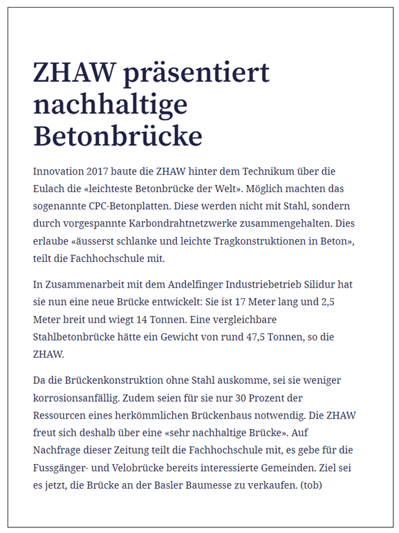 Innovation aus Winterthur - nachhaltige Betonbrücke