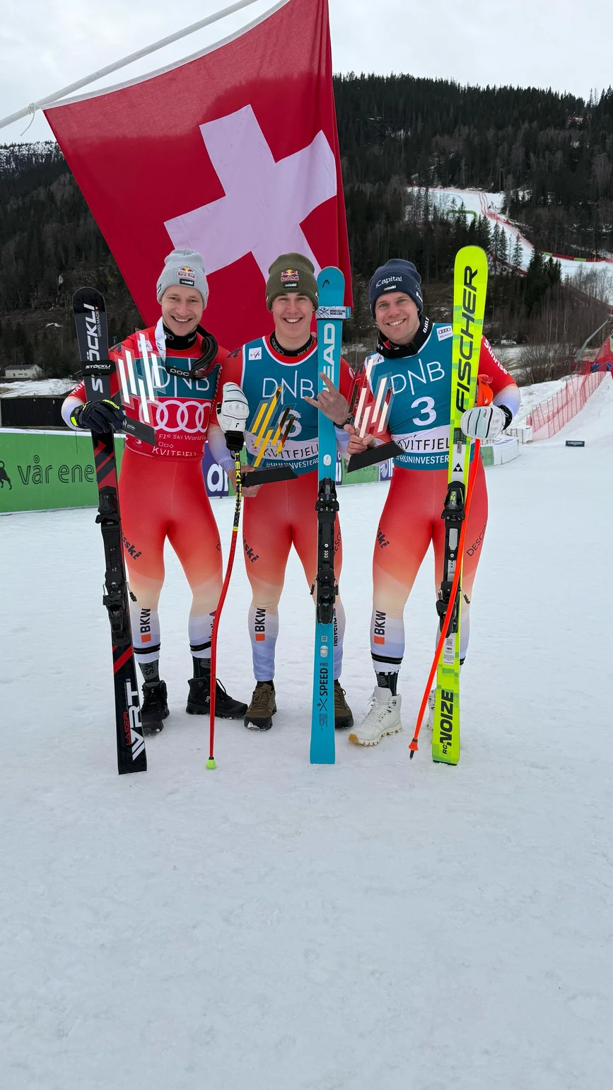 In der ersten Abfahrt gelang mir zum ersten Mal in meiner Karriere der Sprung auf ein Abfahrts-Podium – am Ende des Tages stand ich auf Rang 3. Ein unglaubliches Gefühl und ein besonderer Moment für mich. Am nächsten Tag wollte ich unbedingt an diese Leistung anknüpfen. Nach einem Fehler im Mittelteil dachte ich zunächst, dass ein weiteres Top-Ergebnis nicht möglich wäre. Doch es stellte sich heraus, dass der Fehler gar nicht so viel Zeit gekostet hatte – und so sicherte ich mir erneut den 3. Rang! Noch spezieller wurde dieser Tag, weil auch Franjo und Odi mit mir auf dem Podium standen – ein weiterer Dreifachsieg für die Schweiz.