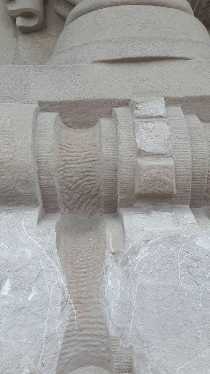 Notmassnahmen bei Abplatzungen durch rostende Armierung, Rissen und Fugen, um weitere Schäden an den Natur- und Kunststeinelementen zu vermeiden.